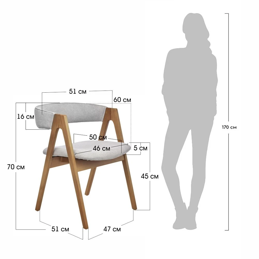 Высота стула делает его удобным для большинства стандартных столов. Ширина и глубина сиденья обеспечивают комфортное размещение, а расположение ножек под углом добавляет устойчивости и надёжности. Высота подлокотников оптимальна для удобного расположения рук.