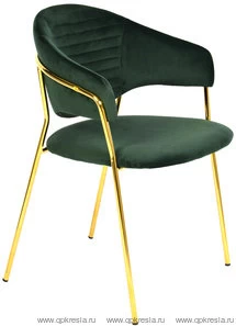 Стильный стул с оригинальной формой спинки, высокой поддержкой и подлокотниками. В качестве обивки используется мягкий вельвет. Металлический каркас золотого цвета огибает спинку и выступает аккуратным акцентом модели. Широкое сиденье обеспечивает удобную посадку и уют.