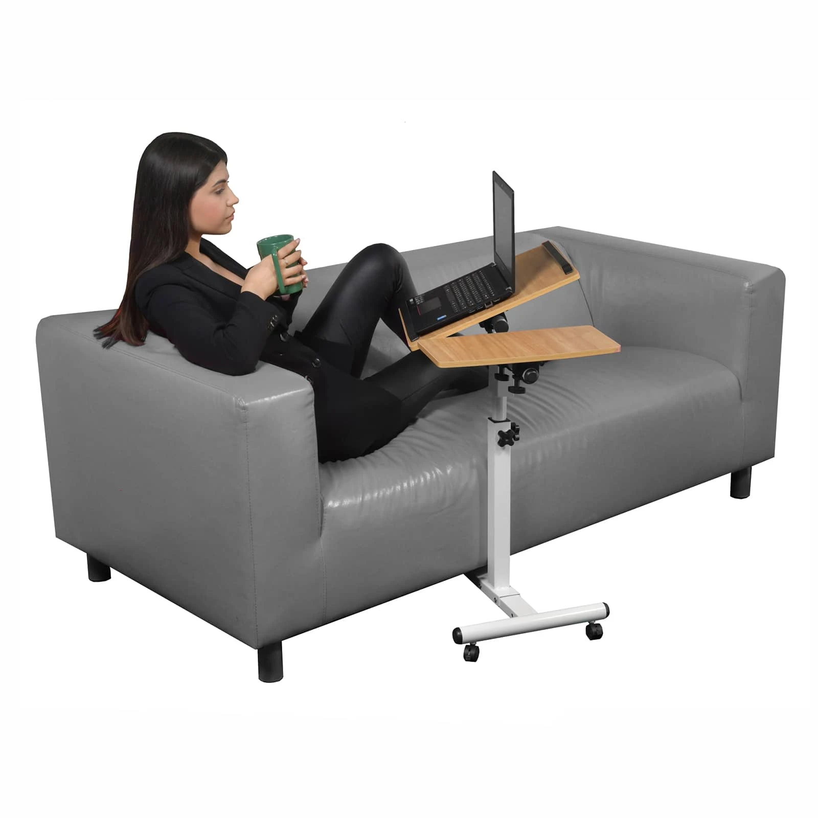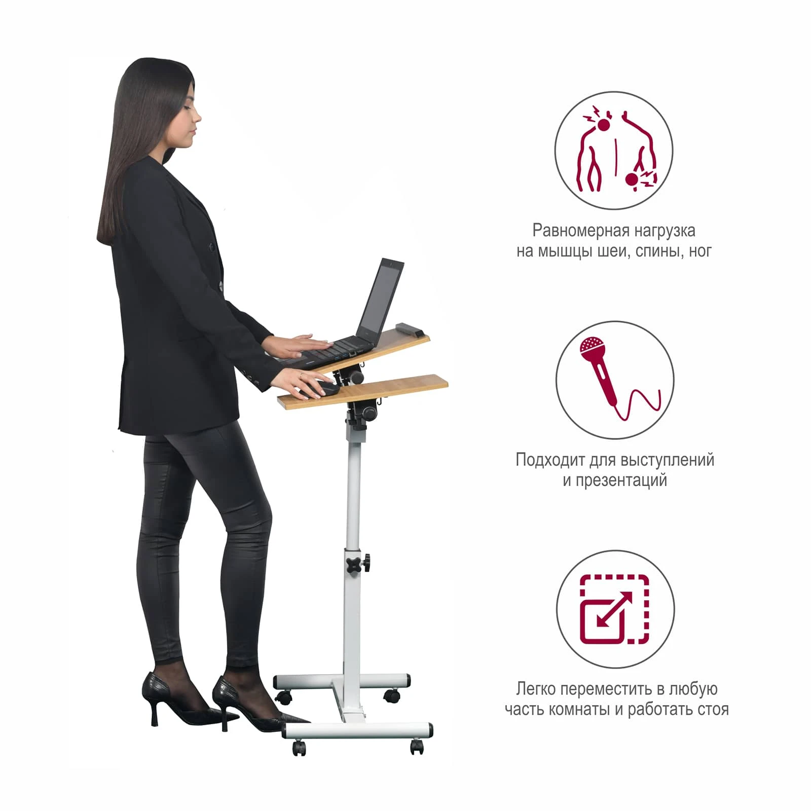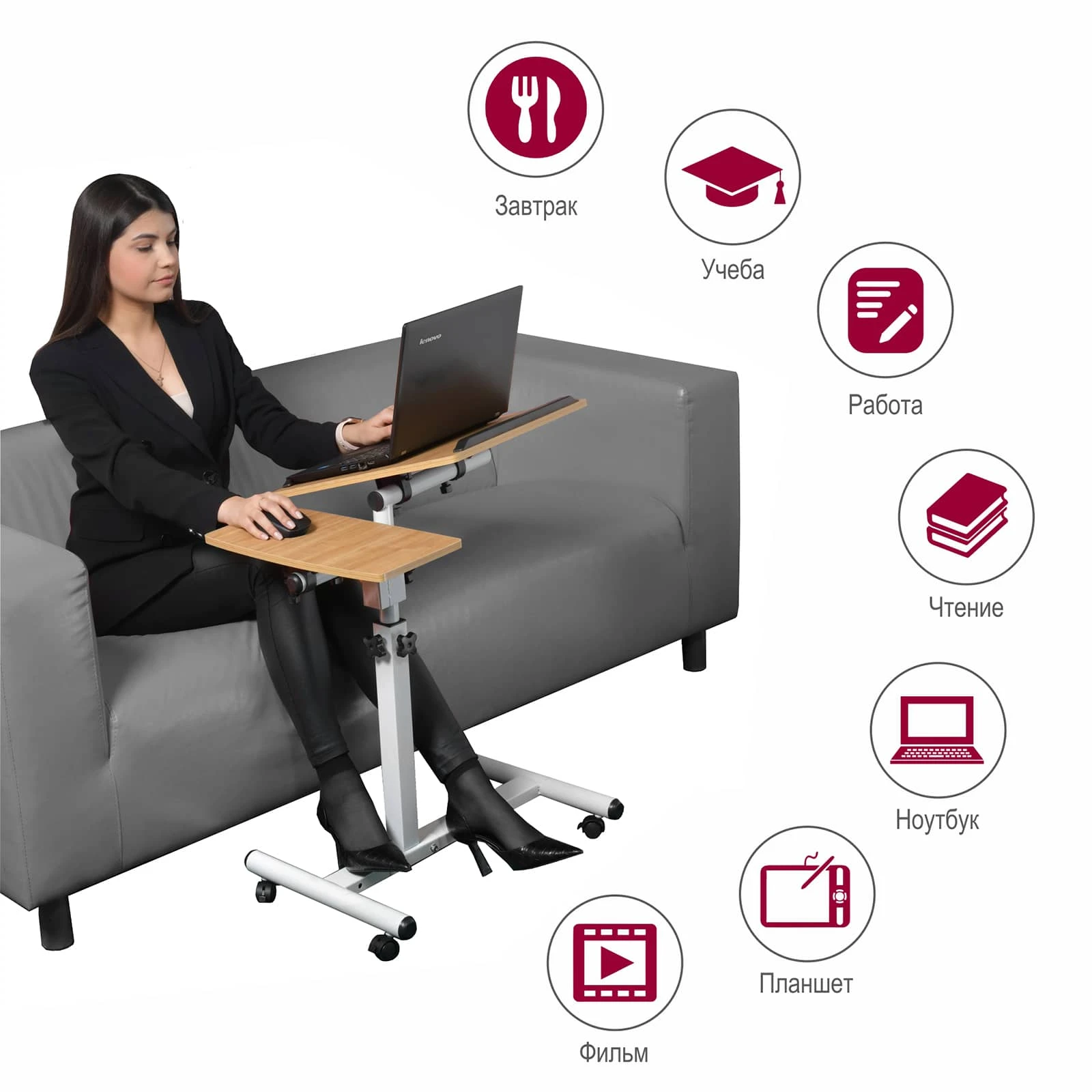 Столик оборудован поворотной столешницей из МДФ, состоящей из двух независимых частей, и металлическим основанием. Угол поворота столешницы составляет 180°, вплоть до вертикального положения. Высота подъема регулируется в диапазоне от 62 до 96 см. На столешнице имеются ограничители для ноутбука, планшета, предотвращающие падение гаджета.