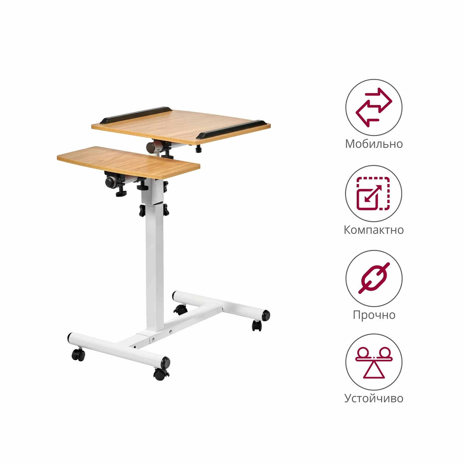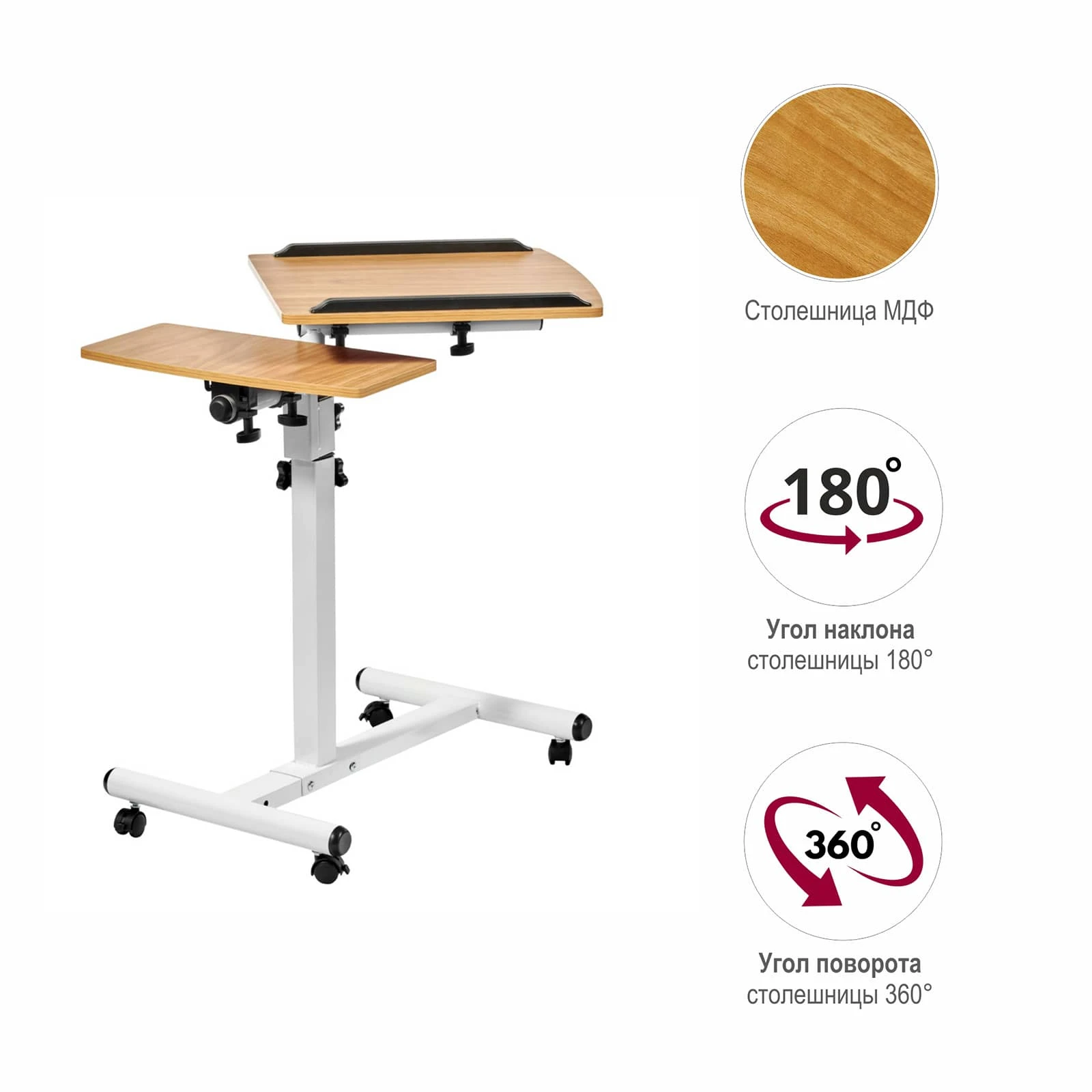 Материал: МДФ12 мм, металл 0.7мм, пластик Кромка ПВХ 0,6 мм Размер: 60x40x62-96см Толщина столешницы: 12мм Размер большой столешницы: 40х40см Размер малой столешницы: 20х40см Вес: 4,5кг Максимальная нагрузка: 40кг Регулировка наклона Регулировка высоты от 62 до 96 см 4 пластиковых колесаНаша бонусная система – это прекрасная возможность отблагодарить Вас за то, что Вы выбрали компанию КупиКресла!