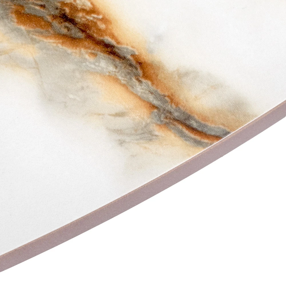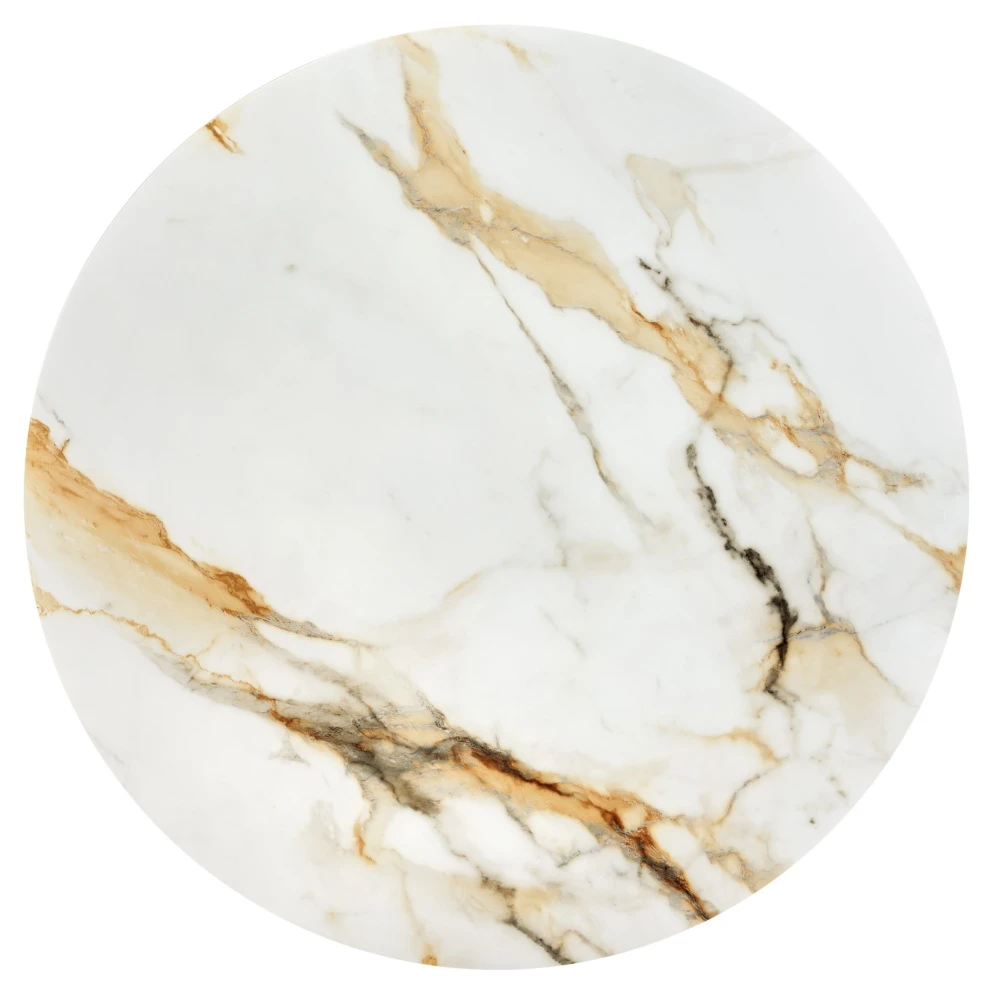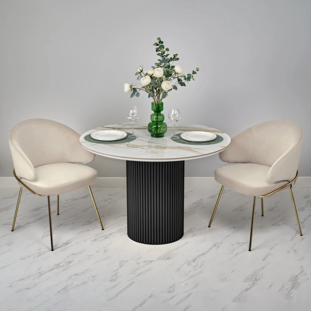 Стильный нераздвижной стол Aura – идеальное сочетание элегантности и функциональности. Стол Aura обладает глянцевой премиальной круглой столешницей из керамики, имитирующей белый мрамор, диаметром 110 см.